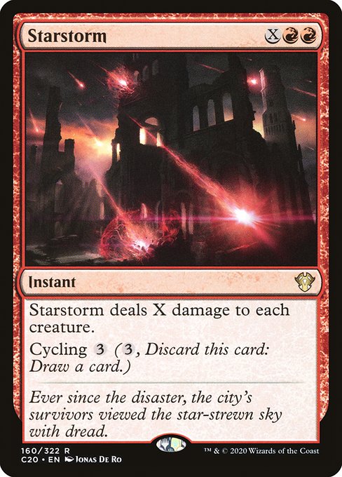 📜 Text: Starstorm deals X damage to each creature. Cycling {3} ({3}, Discard this card: Draw a card.)